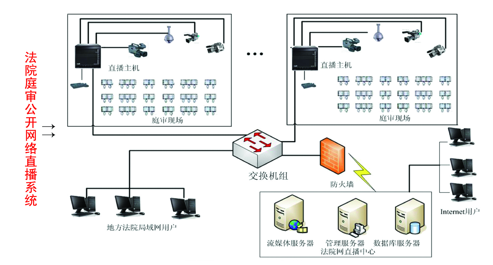 網(wǎng)絡(luò)直播、導(dǎo)播系統(tǒng)是集切換臺、調(diào)音臺、字幕機(jī)、臺標(biāo) 時(shí)鐘發(fā)生器等功能于一體,通過對庭審過程中各個(gè)席位的攝像機(jī)位進(jìn) 行采集,實(shí)現(xiàn)了對多路視頻信號的實(shí)時(shí)切換、編碼,同時(shí)對廣域網(wǎng)和 局域網(wǎng)直播,在直播的同時(shí)進(jìn)行錄制高品質(zhì)的音視頻流,既滿足了庭 審過程中影像資料的存檔、又實(shí)現(xiàn)了人民群眾的在線監(jiān)督與領(lǐng)導(dǎo)遠(yuǎn)程 觀摩的需求,使庭審過程與信息技術(shù)緊密結(jié)合。
